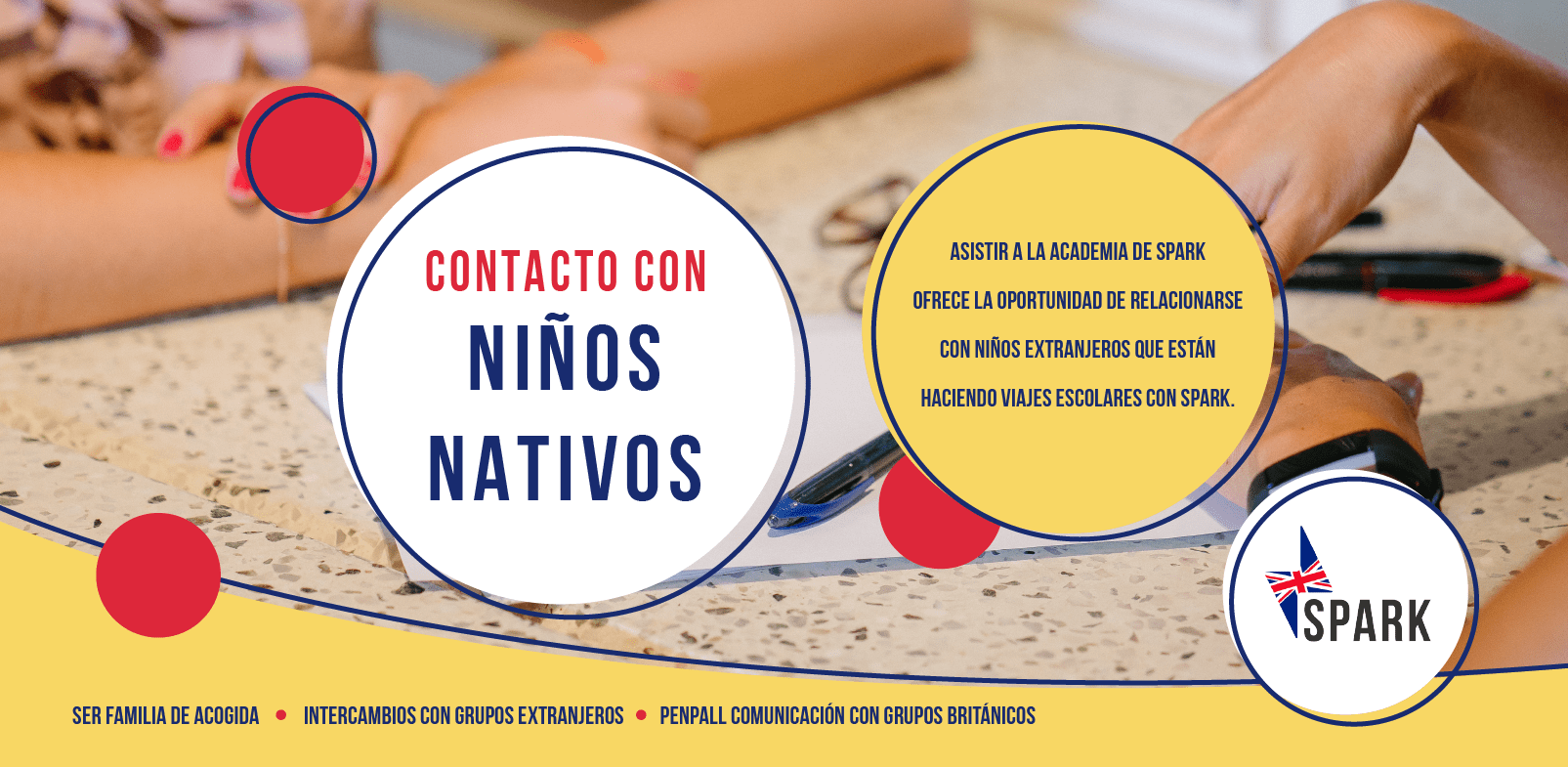 En Spark durante el curso escolar se desarrollan programas de inmersión cultural con estudiantes de español que vienen a pasar unos días a España. Pues gracias a estos programas realizamos sesiones de conversación con los alumnos de nuestra academia y los del cole visitante. Ademas ofrecemos la posibilidad de ser familia de acogida para estos alumnos durante su estancia en España. Es toda una oportunidad única de que tus hijos aprendan inglés, la cultura inglesa y ganen una amistad para toda la vida.